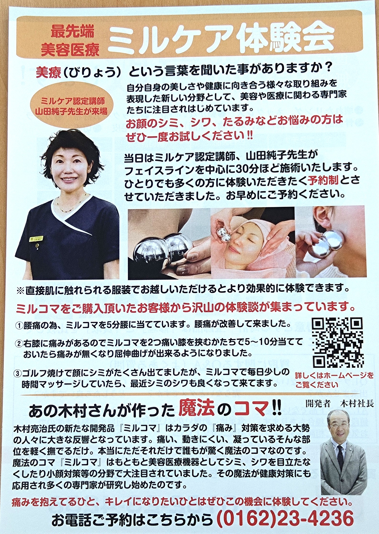 ミルケア認定講師、山田純子先生によるミルケア体験会を同時開催いたします。